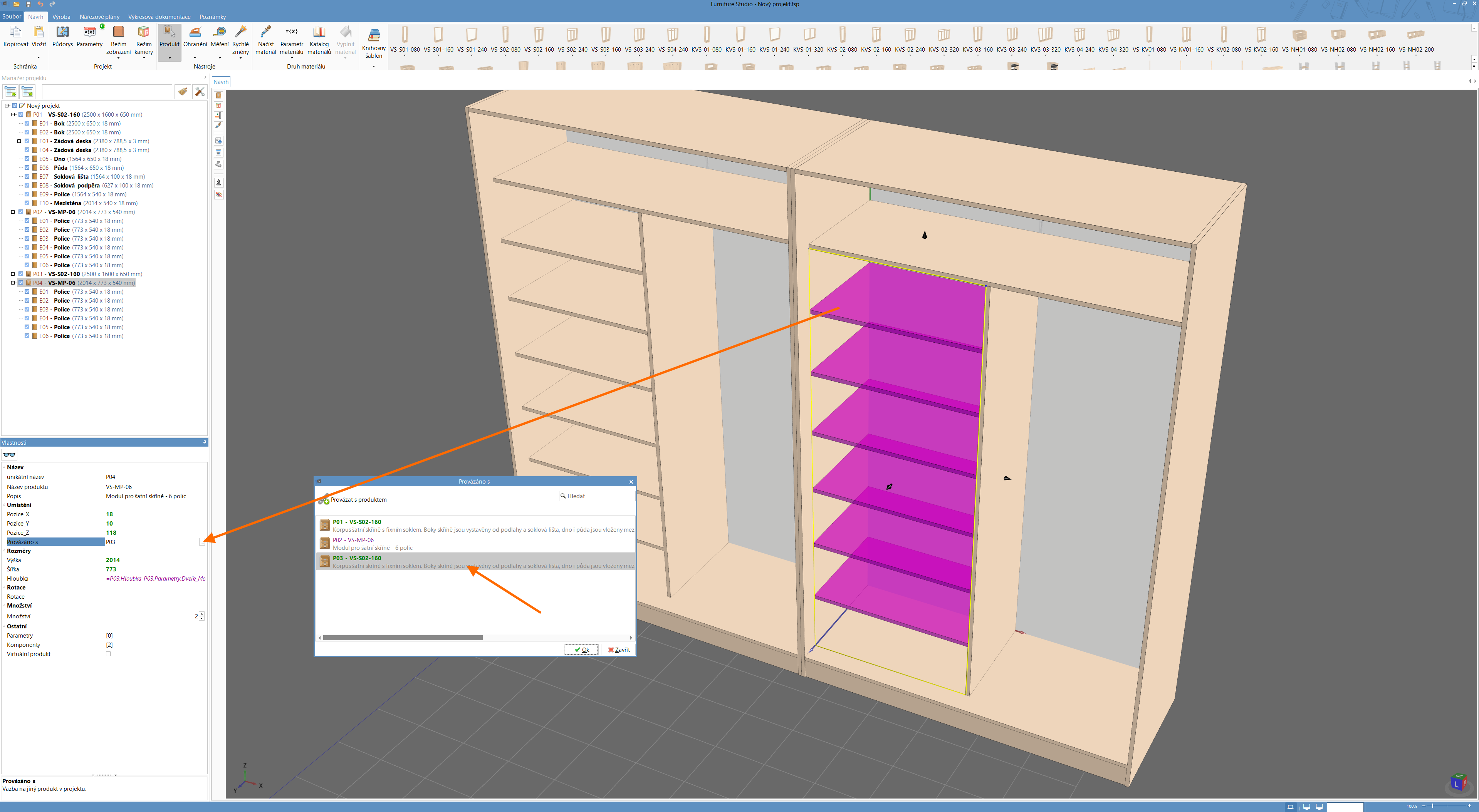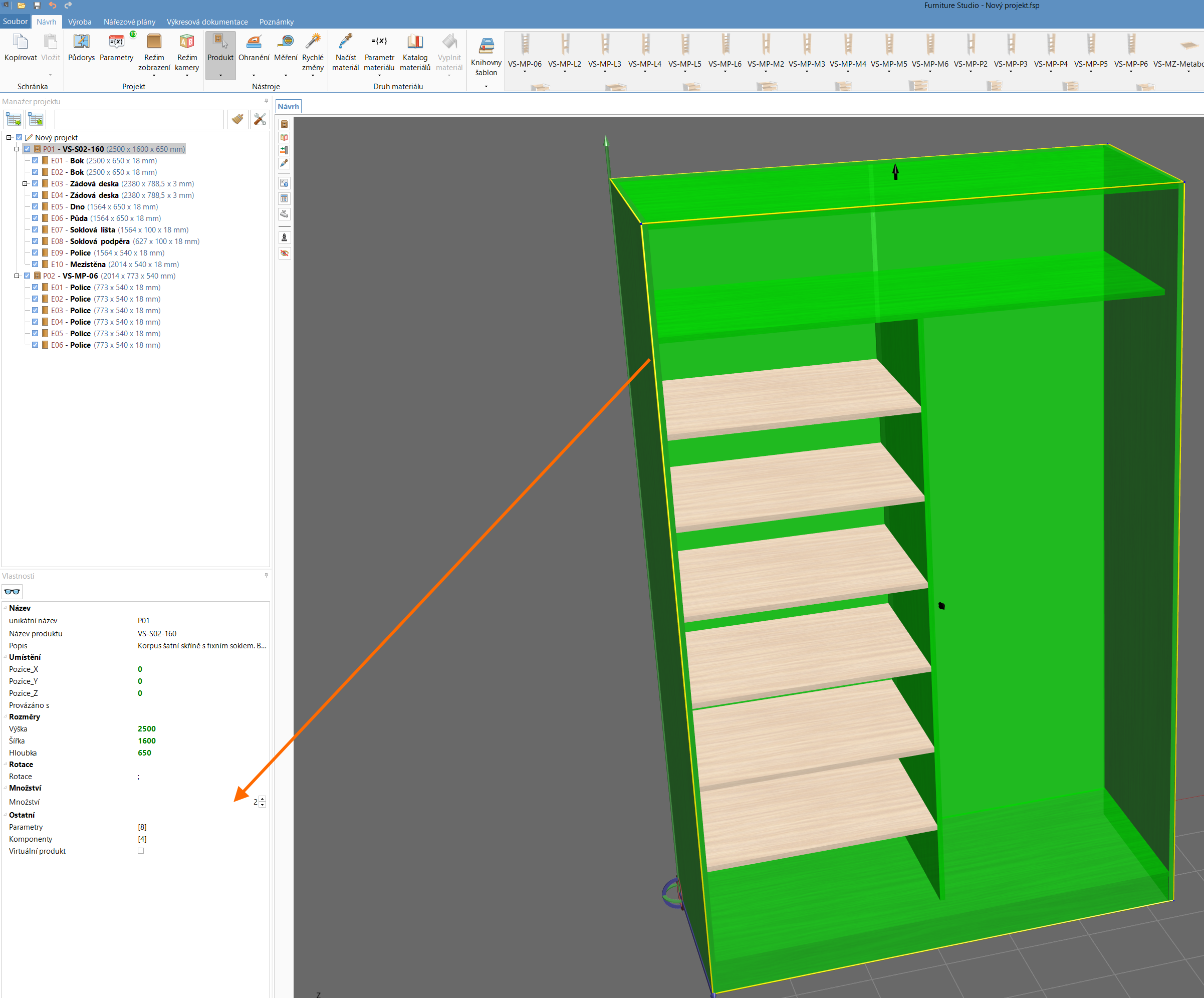 pokud jde o vestavěnou skříň, která se skládá z několika produktů, je nutné nakopírovat zvlášť korpus a pak jednotlivé moduly. Pokud je druhá skříň identická a potřebujete ji vyrobit 2x, tak u každé části skříně (korpus, moduly) nastavte parametr Množství v editoru vlastností na 2. Viz. příloha.