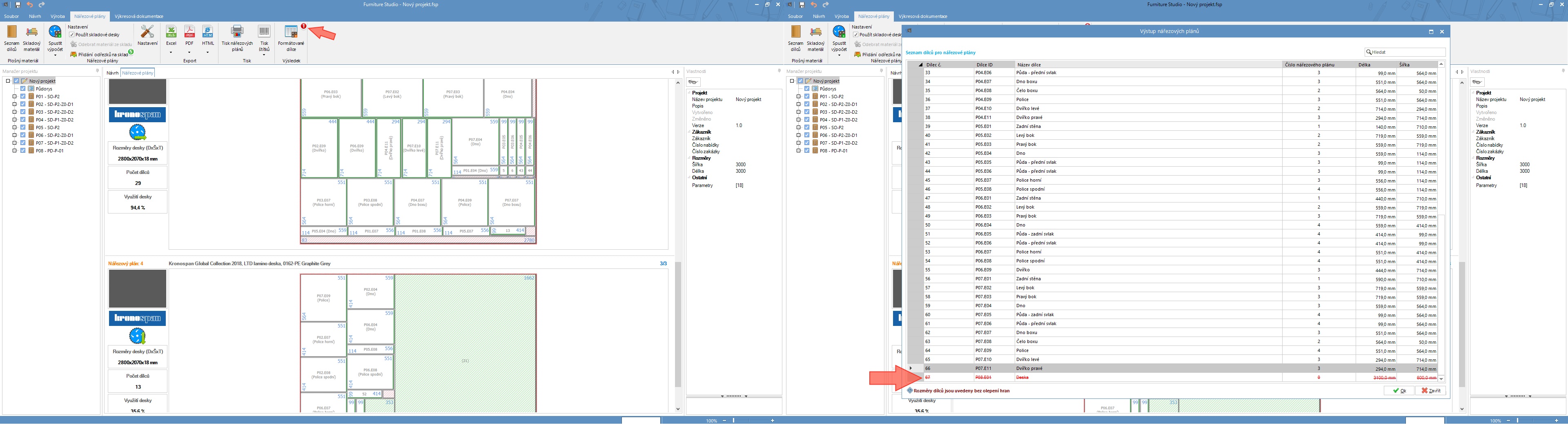 Dílce, které se nevejdou na desku se po výpočtu nářezového plánu vypíší v tabulce s výpisem formátovaných dílců červeně. Informaci najdete v záložce nářezové plány u tlačítka Formátované dílce.