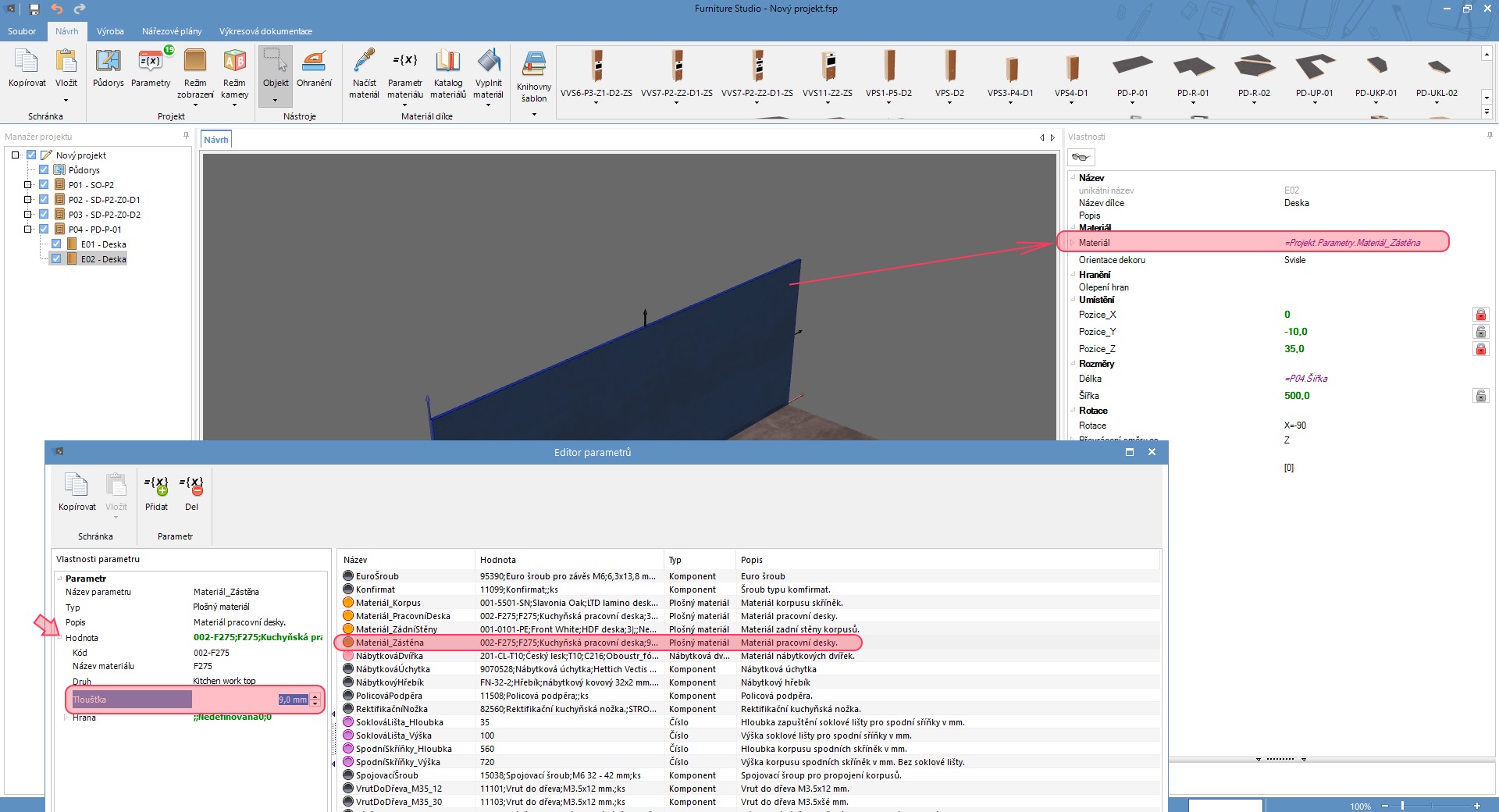 Zatím to můžete řešit tak, že si zadefinujete vlastní parametr materiálu pro zástěnu a vyberete pro něj nějaký dekor pracovní desky. Dále pak rozklikněte hodnotu materiálu v editoru parametru a místo tloušťky 38 mm zadejte např. 9 mm. Tento materiál pak přiřaďte vašemu dílci zástěny v projektu.